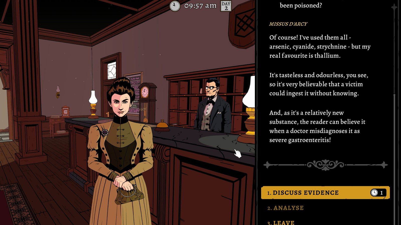 Éppen ezért óvatosan és körültekintően kell eljárnunk, hogy elérjük a célunkat. Ám nem szabad abban a hitben ringatnunk magunkat, hogy időnk, mint a tenger. Épp ellenkezőleg – és pont ebből fakad a játék egyik legerősebb pontja és mechanikája: az időkezelés. A képernyő tetején folyamatosan láthatjuk a napszakot és a pontos időt, ami kulcsfontosságú, hiszen az óra mutatója kizárólag a mi cselekedeteink hatására halad előre. Egy tárgy megvizsgálása és használata, egy karakter kihallgatása, vagy akár egyetlen festmény alapos szemügyre vétele is percekbe kerül. Ráadásul nem tudjuk előre, mi lendít minket előre a történetben, mi szolgál csupán a lore kibontására, és minek a megvizsgálása volt teljes időpazarlás.